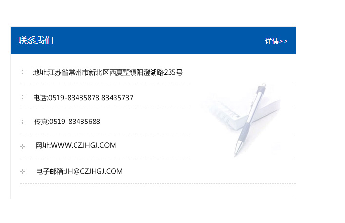傳真:0519-83435688    郵編:213135    網址:WWW.czjhgj_com.28card.com    電子郵箱:JH@czjhgj_com.28card.com